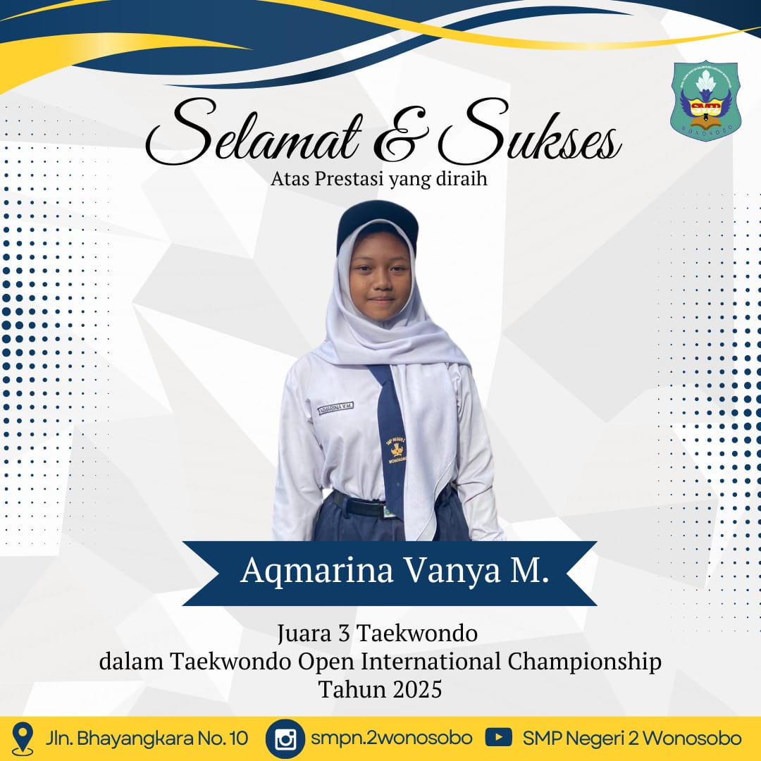 Aqmarina Vanya M. adalah satu dari sekian banyak anak di SMP Negeri 2 Wonosobo yang memiliki banyak prestasi, salah satunya adalah Juara 3 pada ajang Taekwondo Open International Championship.